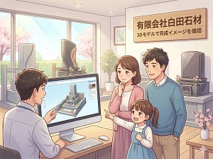新しくお墓を建てる方、古くなったお墓をリフォームされる方へ。 当店では、図面だけでは分かりにくい完成時のイメージを、**「3Dモデル」**を活用した立体画像でご確認いただいております。 「建てる前に仕上がりが想像できて安心した」と多くのお客様にご好評いただいているサービスです。石の種類やデザインなど、細かなご要望もしっかりと形にいたします。
